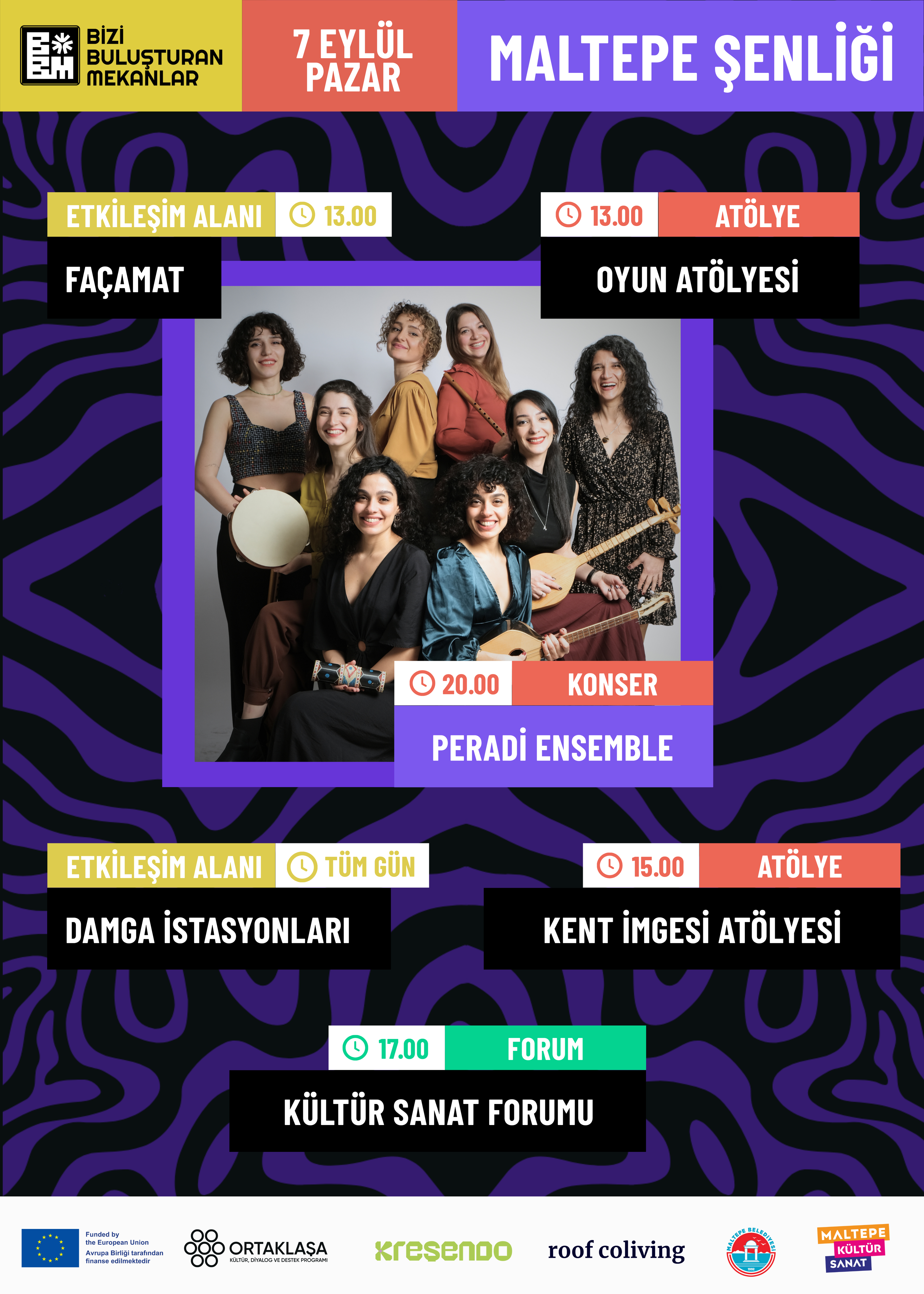 Kent İmgesi Atölyesi, Maltepe’nin kültürel imgelerini tartışmaya davet ederken alanda yer alacak Damga İstasyonları ziyaretçilere şenlik hatıraları sunacak. Bizi Buluşturan Mekanlar Projesi’nin tanıtılacağı Kültür Sanat Forumunun ardından çok sesli ve çok dilli kadın vokal topluluğu Peradi Ensemble; Anadolu, Balkanlar, Kafkaslar ve dünyanın farklı coğrafyalarından halk ezgilerini seslendirecek.